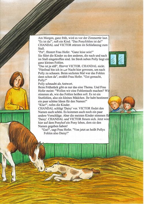 Hier nun eine Textseite des Kinderbuches 'Ponyfarm', wie sie im fertigen Buch aussieht. Der Name des beschenkten Kindes lautet Chandal, ihr Freund heißt Victor.