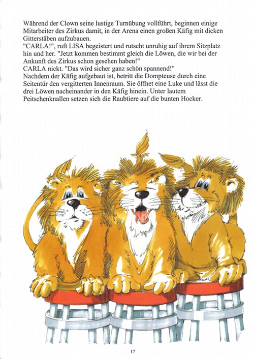 Hier nun eine Textseite des Kinderbuches 'Der Zirkus ist in der Stadt', wie sie im fertigen Buch aussieht. Der Name des beschenkten Kindes lautet Carla, ihre Freundin heißt Lisa.
