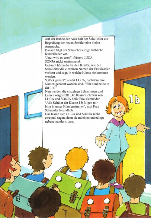 Hier nun eine Textseite des Kinderbuches 'Mein Schulanfang', wie sie im fertigen Buch aussieht. Der Name des beschenkten Kindes lautet Luca, ihre Freundin heißt Sonja.